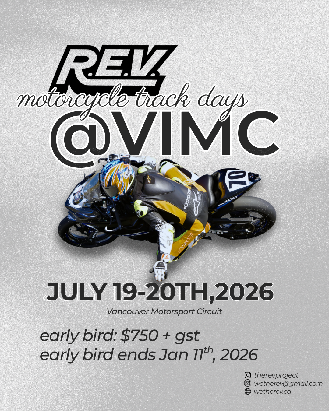 Welcome to R.E.V. Get ready to experience the excitement of motorcycle Track Day with our expert coaches. Learn More View fullsize VIMC 2026July 19th & July 20th RSVP Follow us on social Social We're Here to Help!